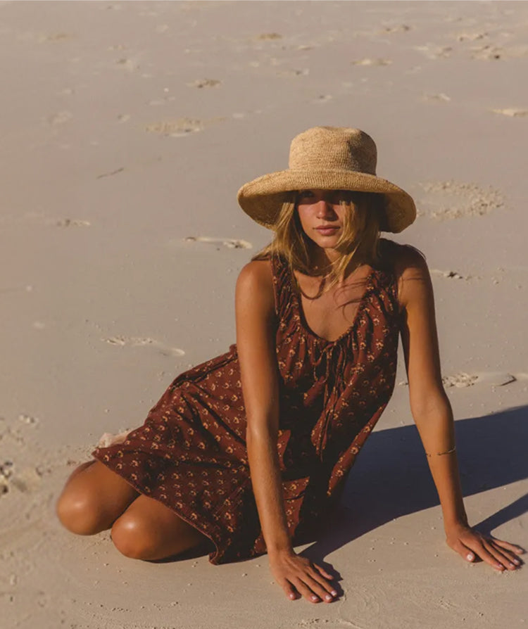 Daughters of India Kyra Midi Dress in Pepper — model on mangrove beach, hand screen print cotton Daughters of India Kyra Midi Dress in Pepper — front view with cream floral print, screen print cotton