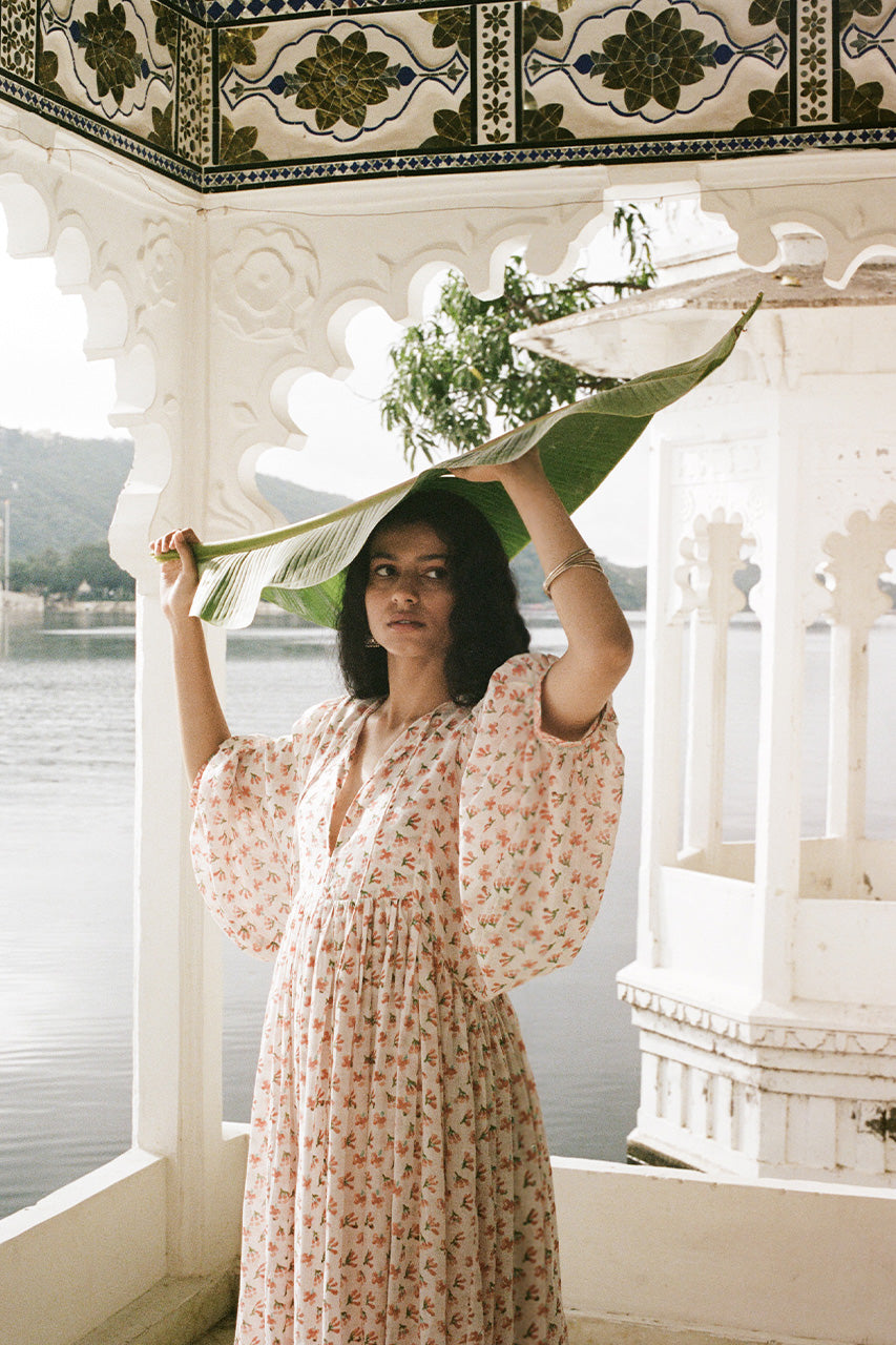 Our signature Kyra Dress in a maxi length, delicately adorned with traditional hand-block printed blooms in peach hues, each petal and pattern tell a story of elegance.