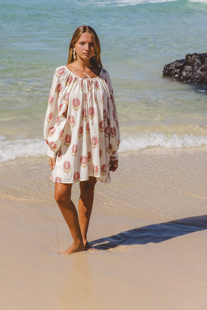 Crafted from 100% cotton, the Ria Mini Dress offers a relaxed, thigh-length fit, with the addition of adjustable gathering at the neckline with a tie. In the sweetest sky blue adorned with a white floral print, Ria delivers the perfect amount of vintage character. Featuring a low scooped neck, pockets, and our signature billowing sleeves finished with a cuff, to compliment this classic oversized-style dress.