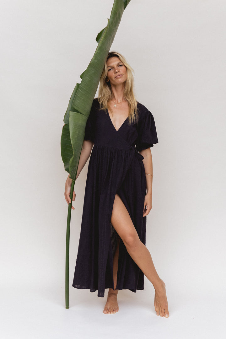 The Uma Maxi Dress is a classic piece slowly and ethically handcrafted from 100% cotton with soft textured stripe detailing. This self-adjustable wrap design provides the perfect balance between a casual and styled look with the special addition of pockets and cute ruffle sleeves for an elegant finish.
