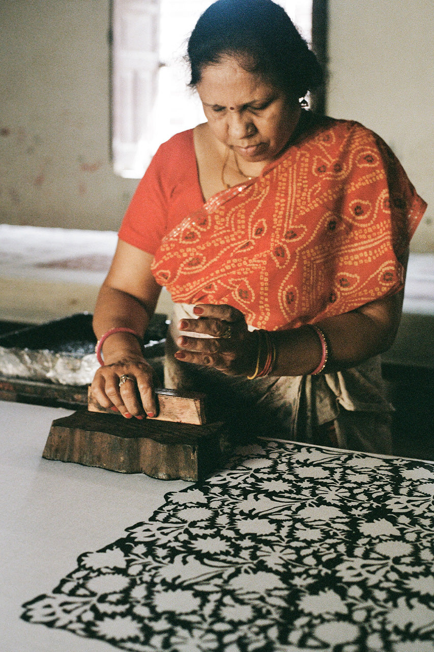 Our signature hand block printed Kyra design in Pepper ~ a traditional Jaal block print featuring a network of white flowers bordered with light brown detailing on a soft black base.