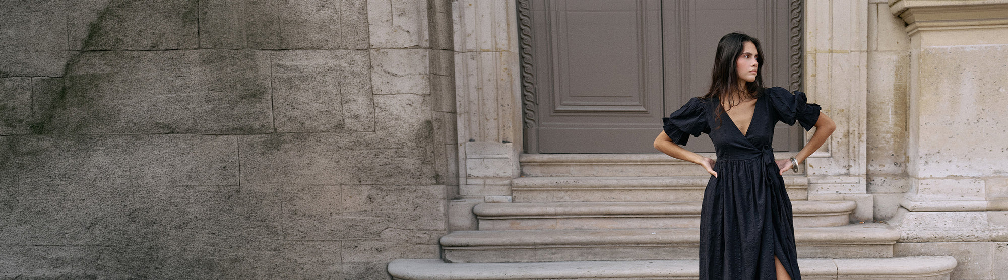 Daughters of India Kyra Midi Dress in Black Gauze — full length by white wall with ceramic pots, cotton gauze Daughters of India Kyra Midi Dress in Black Gauze — close-up V-neckline and billowed sleeves, gathered waist, cotton gauze